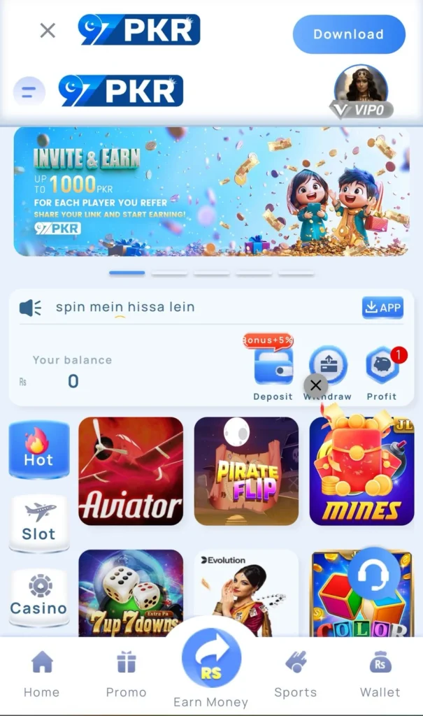 97pkr Game is a mobile casino-style earning app that allows Pakistani users to play and earn money online. The platform provides multiple gaming options such as slot machines, fishing games, card games, lotteries, and live sports betting. Unlike many global apps, 97pkr Game supports local payment systems, which makes it convenient for Pakistani players.